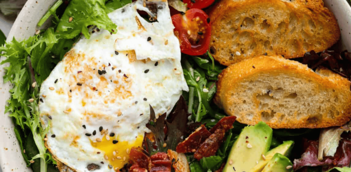Looking for the best way to start your day? This hearty breakfast salad is the perfect choice! You’ve got fresh lettuce topped with a fried egg, crispy bacon, sliced avocados, toasted bread, and grape tomatoes, all finished off with a squeeze of lemon, olive oil, and everything bagel seasoning. It’s light enough that you’ll be able to enjoy it in the morning, but will keep you full throughout the day!