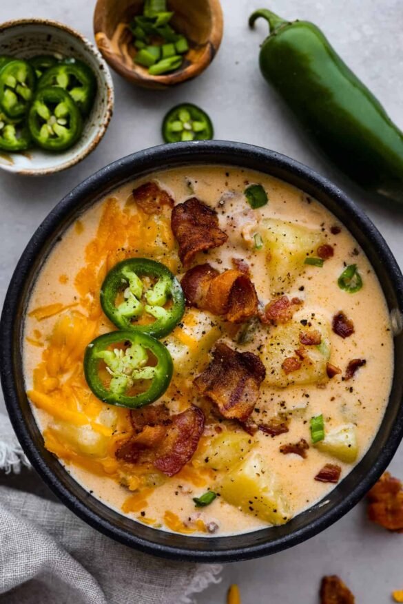 Start by sautéing the bacon until it’s delightfully crispy, then transfer it to your trusty slow cooker. Toss in those diced jalapeños, onions, and garlic, and sprinkle in the flour. Give it a good stir. Add in the chicken broth, half-and-half, and potato chunks. Then set your slow cooker to low, cover, and let it simmer away for 6-8 hours, while you conquer your day. Once it’s done, mix in your cheese and toppings and serve!