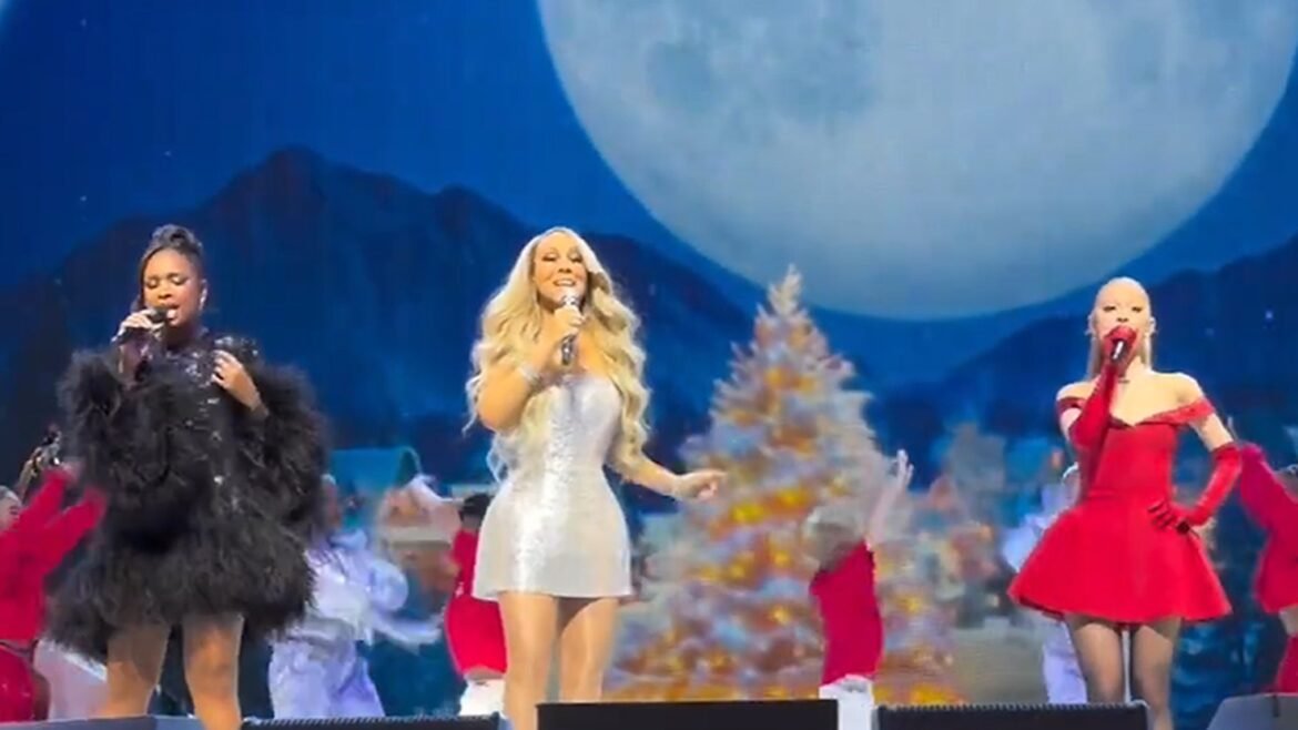 Mariah took the New York audience by surprise when she announced she had an “unexpected, yet amazing” treat. First, Mariah called Ariana and Jennifer “Christmas angels” and then asked them to come help her sing the Xmas tune.