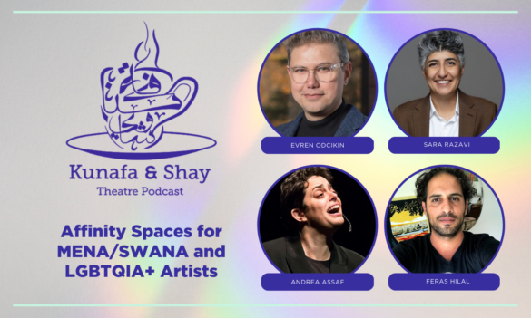 Marina: Thank you so much. We started this season talking about queer MENA, SWANA artists with Adam Elsayigh who is not in the room right now. But when we talked to Adam, he said, “Really? A season on queer? Okay. Is this really the framing you want to do?” And he asked some really important curatorial questions that we appreciated. Acknowledging that now, so we don’t necessarily need to dig into that in this episode. It exists and I hope that you’ll look at that framing because it was a great question that Nabra and I had already been talking about because it can be tokenizing and essentializing but it can also be really affirming and productive to be in a space dedicated to addressing the lived experience of these intersectional identities. I also wanted to mention that this morning I was reflecting on what we were doing today and the podcast started whenever… I called Nabra one day… well, I started my PhD and I thought, “Now I’m going to be in a space with people where I can talk about MENA theatre all day long and they’re going to care.”