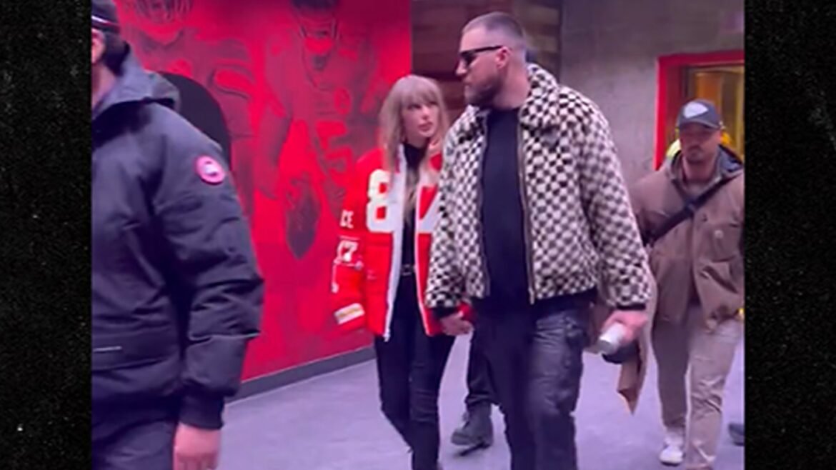 Check out the video … Taylor, decked out in her red Chiefs jacket, is totally glued to Travis, sporting cool sunglasses and black leather pants. In another angle from behind … the two are holding hands as the back of Taylor’s coat is in full view — emblazoned with the name “Kelce” and his NFL number “87.”