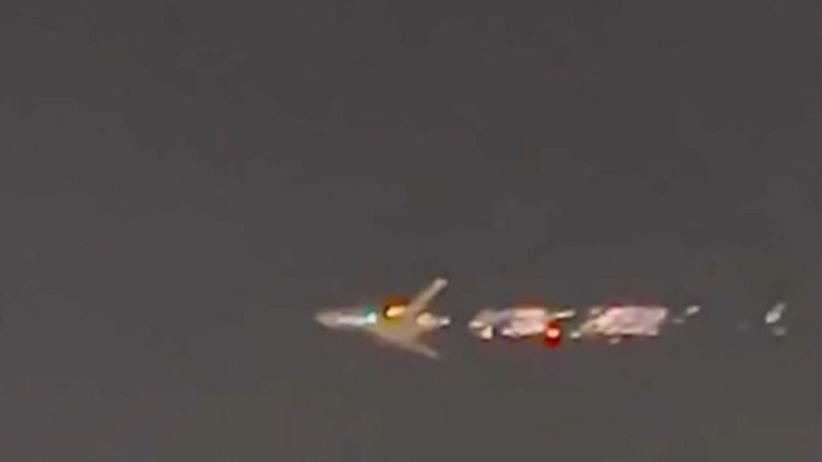 Check it out … Sparks shoot out from the rear of the jet as the woman expresses utter shock, “Oh my god. It’s on fire. Oh my god.”