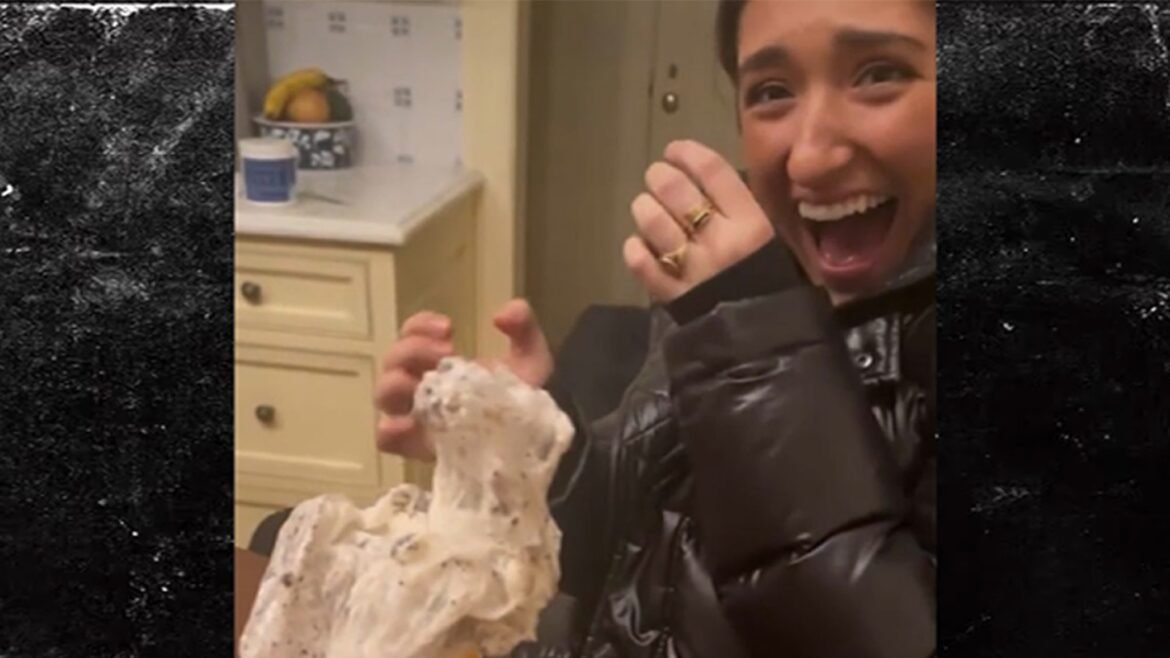 You’ll be repulsed watching the clip yourself … the woman discovers what appears to be a trash bag or glove left behind in her Oreo-flavored frozen treat — horror plays out on her face as she continues pulling out the seemingly never-ending item.