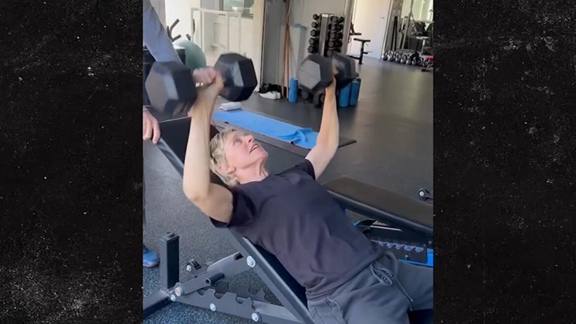 Ellen then did one-arm overhead presses using a single dumbbell before pushing a large piece of exercise equipment across the gym floor and ending her routine with a series of pullups. Pretty Impressive, Ellen!