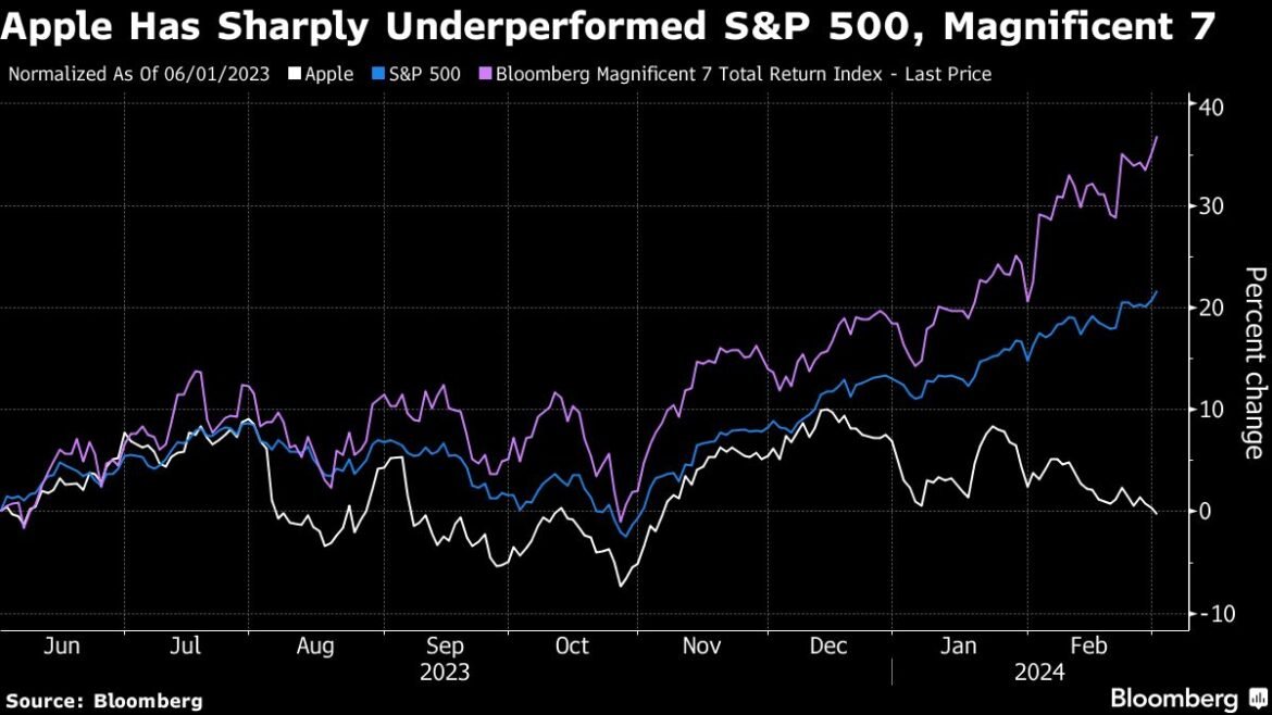 Apple has lagged its Magnificent 7 peers even more dramatically, trailing all but Tesla Inc. Concerns of a prolonged iPhone sales slump have been the main culprit, particularly as China’s economic troubles continue.