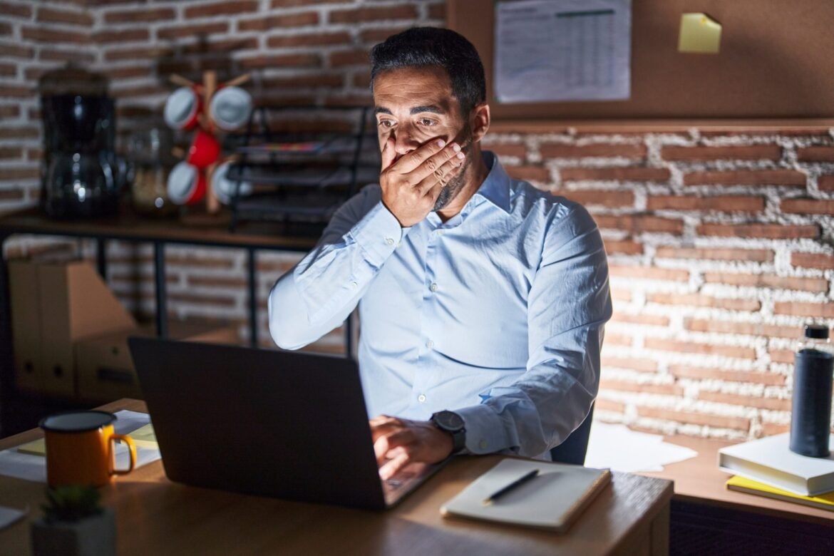 Shocked older man looking at laptop finding private information leaked or identity theft or some other online mistake