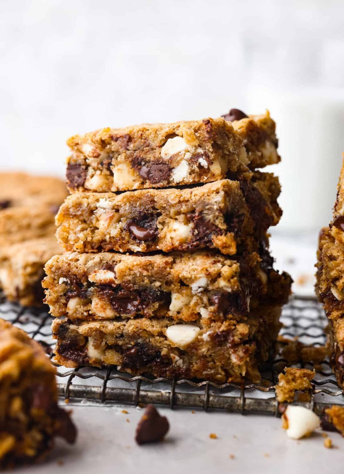 - Sugars: I used both granulated and brown sugar for a deeper sweetness and toffee flavor. Light brown sugar will work, but I’ve found that dark brown sugar really takes the flavor of these cookie bars to the next level.