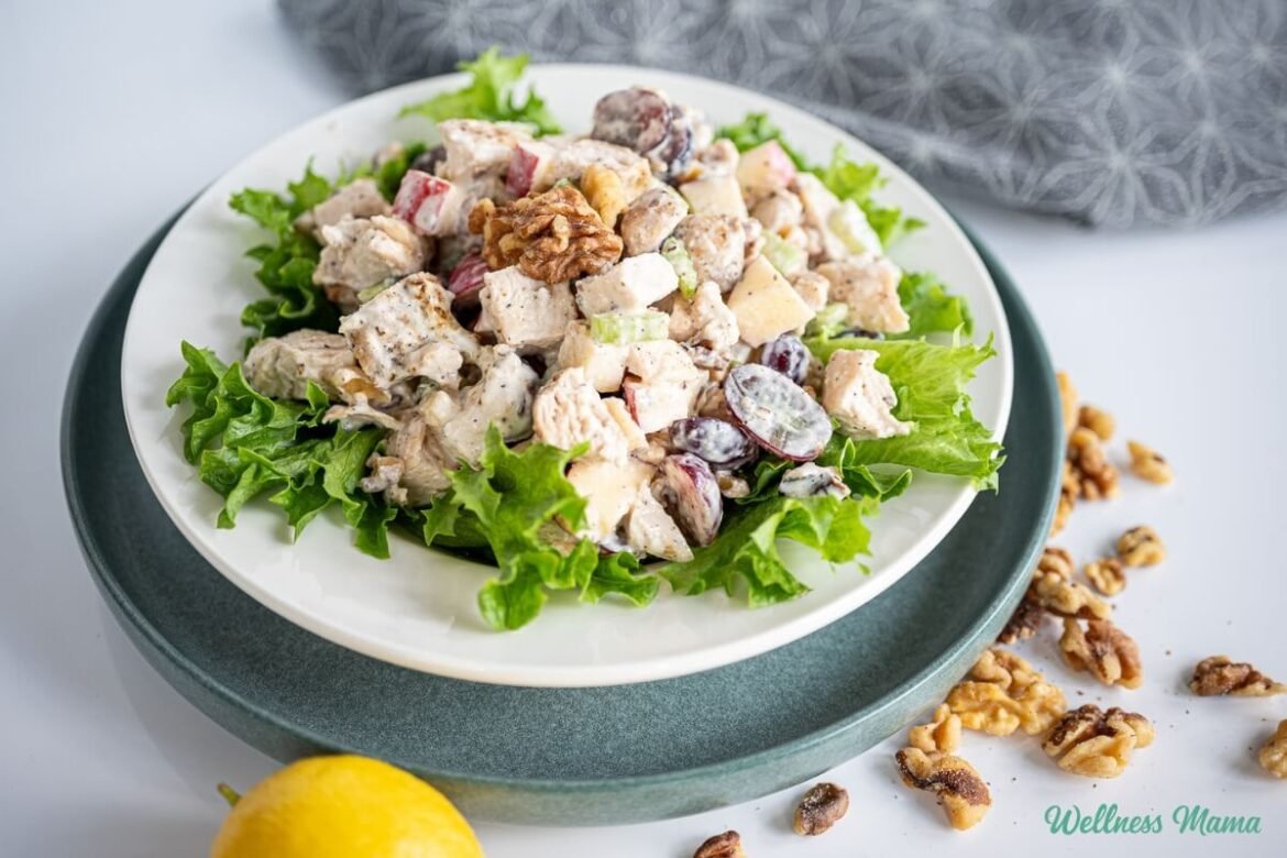 This recipe makes a great mason jar salad for easy lunches or meals on the go. Just put the chicken salad in the bottom of a mason jar and lettuce or spinach on top and twist on the lid.