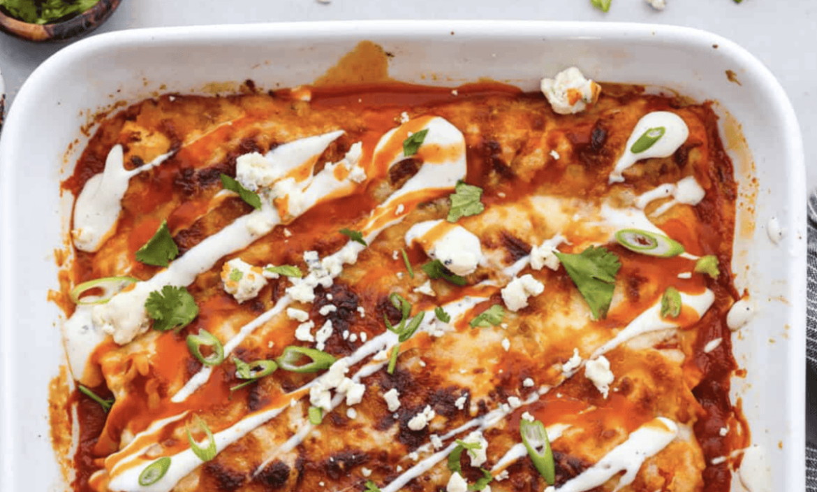 - More Toppings: Instead of blue cheese dressing, drizzle the enchiladas with ranch dressing. Try topping the enchiladas with sliced avocados or salsa!