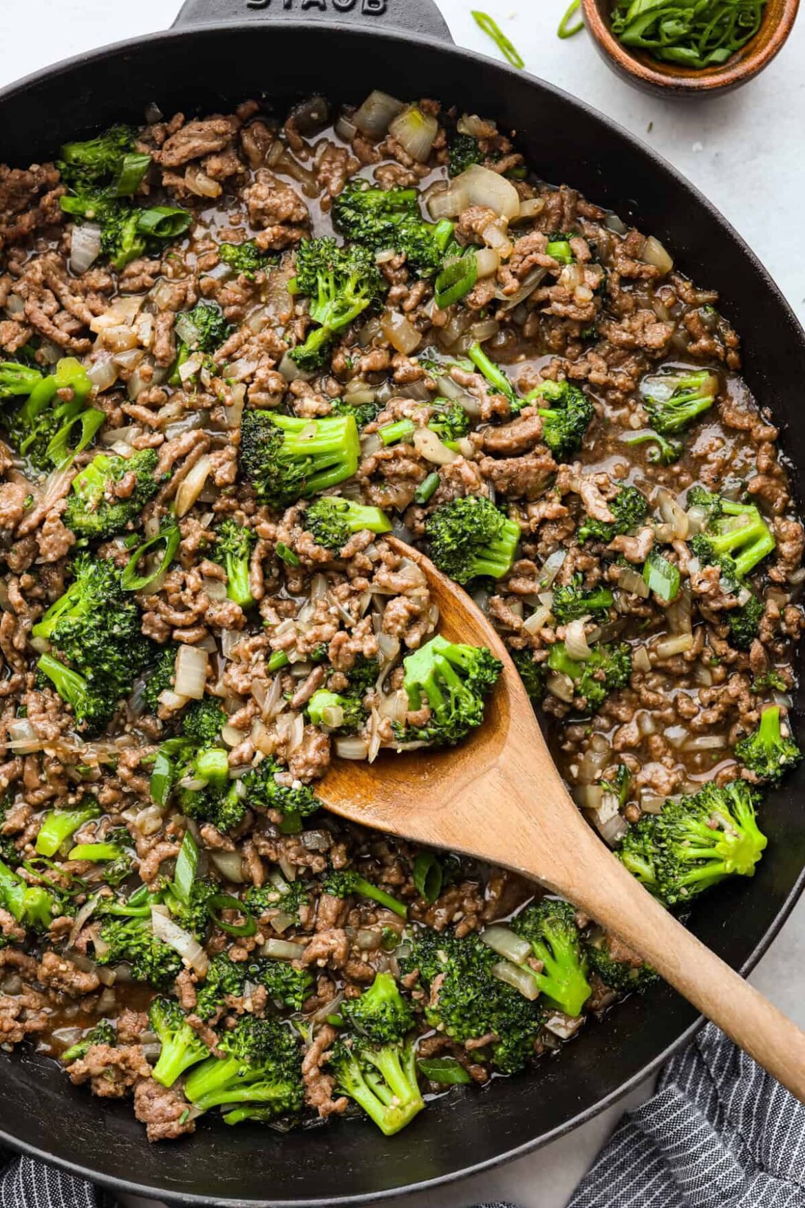 Overhead shot of ground beef and broccoli in skillet with wooden spoon.