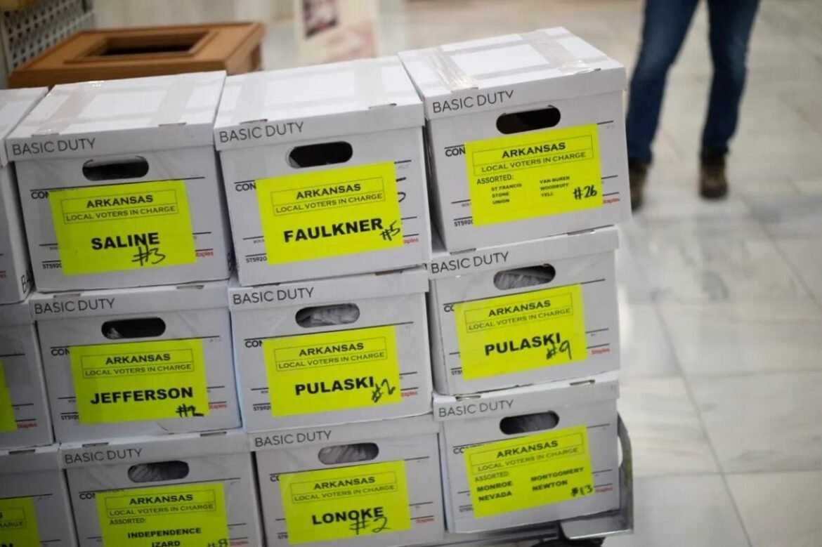 Local Voters in Charge submits boxes of voter signatures in July to Arkansas Secretary of State John Thurston’s office. A rival political committee is asking the Arkansas Supreme Court to dismiss the ballot referendum that seeks to revoke a gaming license in Pope County. (Image: Arkansas Times)