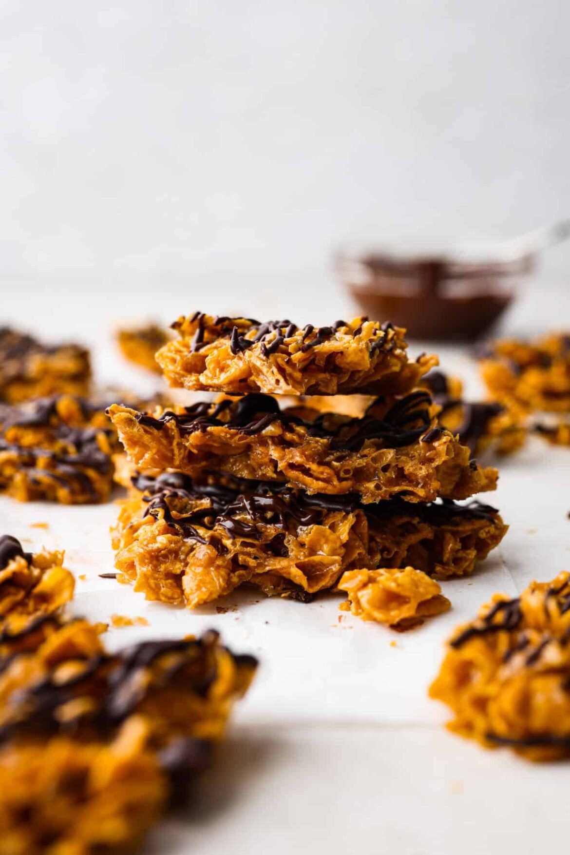 This cornflake crack brittle is crispy, chewy, and to die for! With only six ingredients and 8 minutes of prep, you can have this yummy treat ready in no time. This brittle is crunchy cornflakes mixed with a buttery caramel sauce and drizzled in rich chocolate.