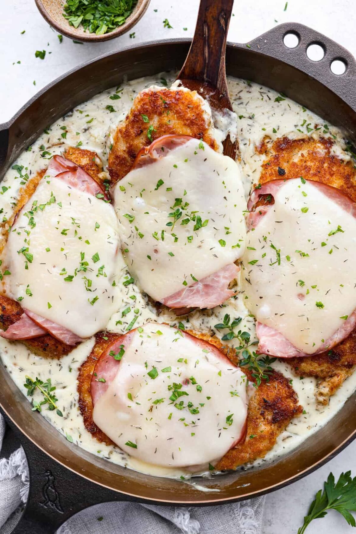 Skillet chicken cordon bleu is one of those recipes my whole family loves. You can’t beat the creamy sauce, crispy chicken, and smokey ham, all covered in melty Swiss cheese.