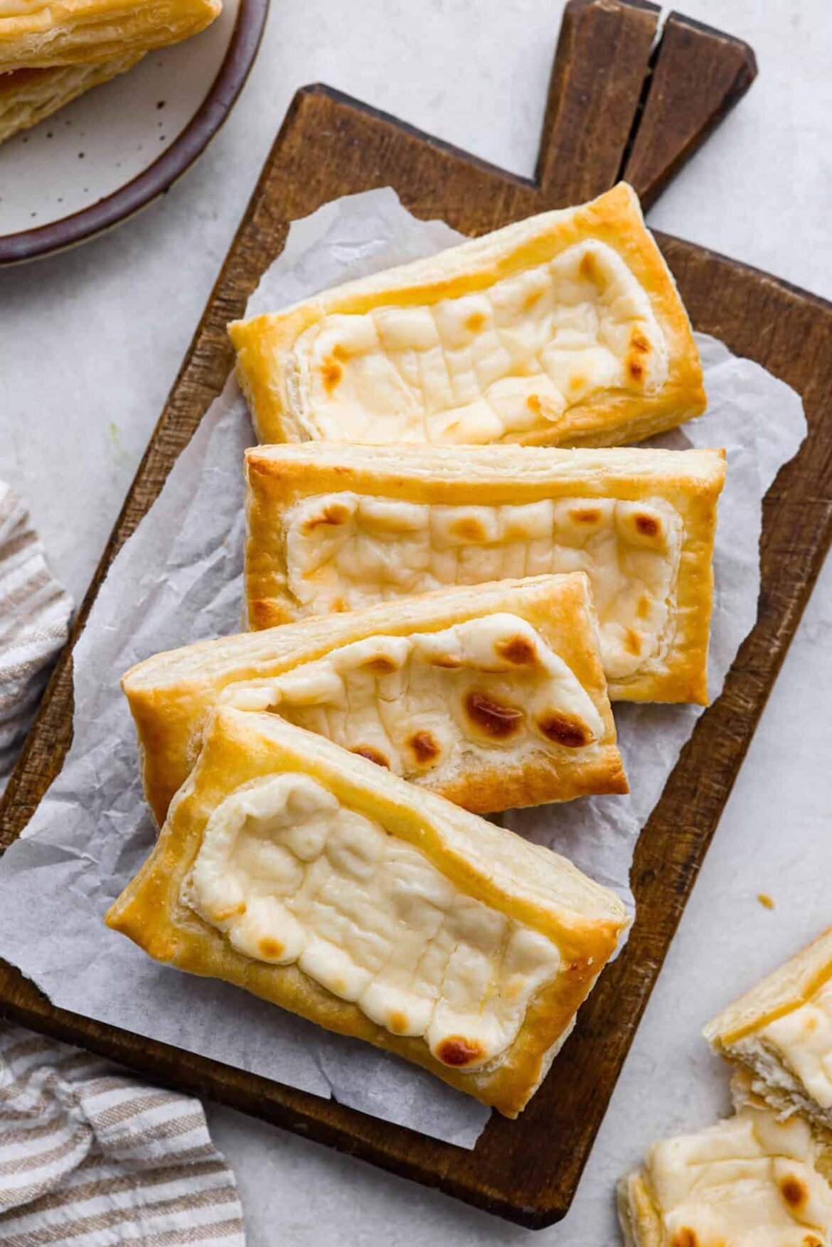 - Add the Filling: Pipe some of the sweet cream cheese filling onto the center of each puff pastry rectangle. Leave a small border of uncovered puff pastry exposed.