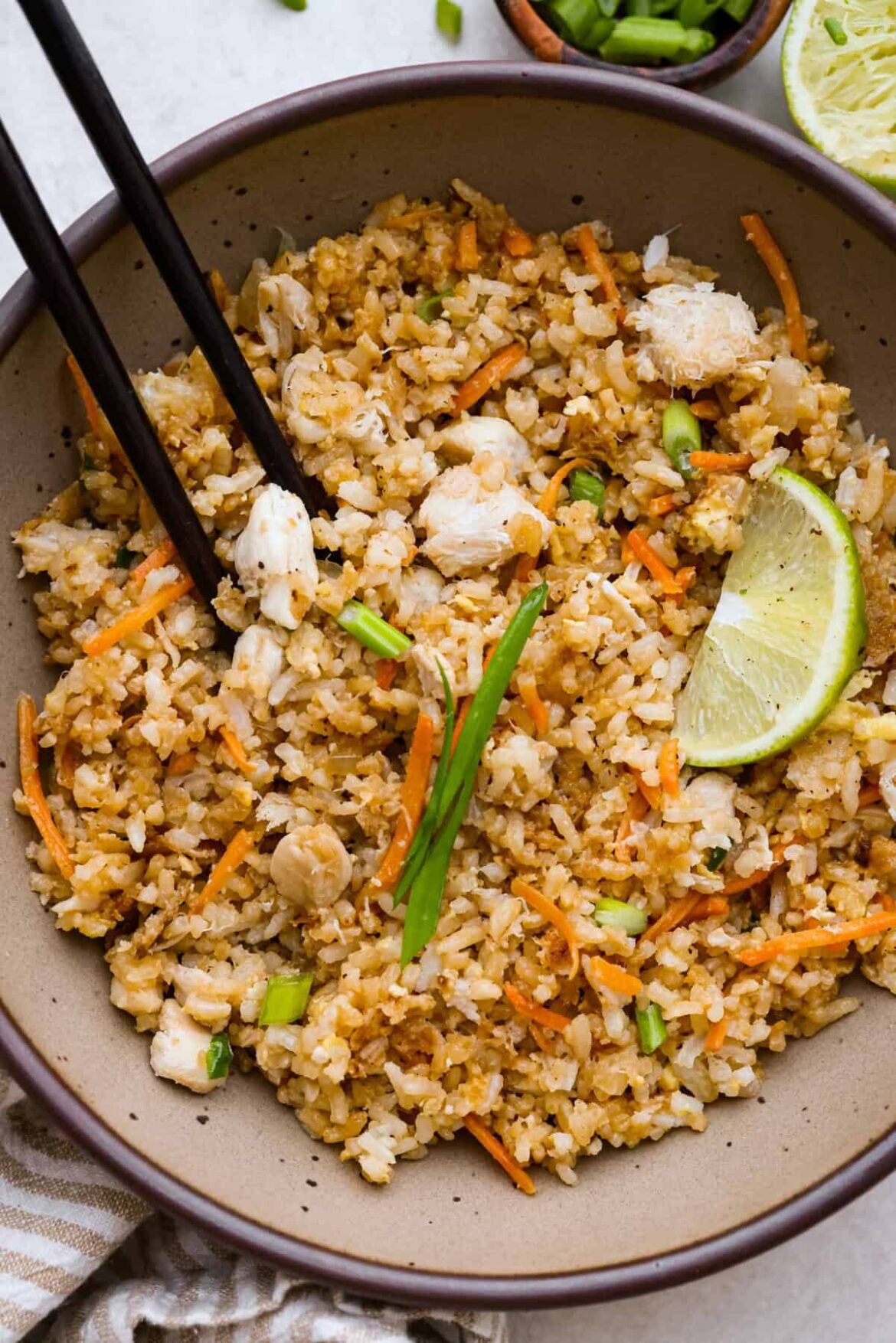 Add the drained 1 (6-ounce) can lump crab, to the wok and stir to combine. Stir in 2-3 tablespoons soy sauce, and the juice of 1 lime, into the fried rice. Toss to combine, then season with ½ teaspoon onion powder, ¼ teaspoon Kosher salt, and ¼ teaspoon cracked black pepper.