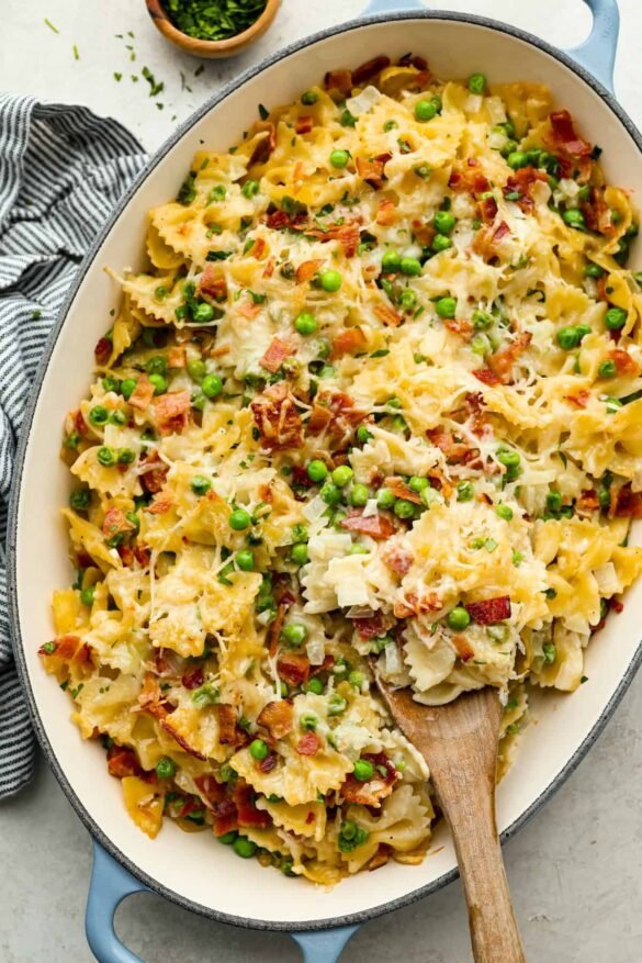 Stanley Tucci pasta casserole is everything you want in a casserole. It’s simple to make and incredibly flavorful! TikTok is going crazy over the crispy bacon, tender peas, and the cheesy, creamy sauce that holds everything together!