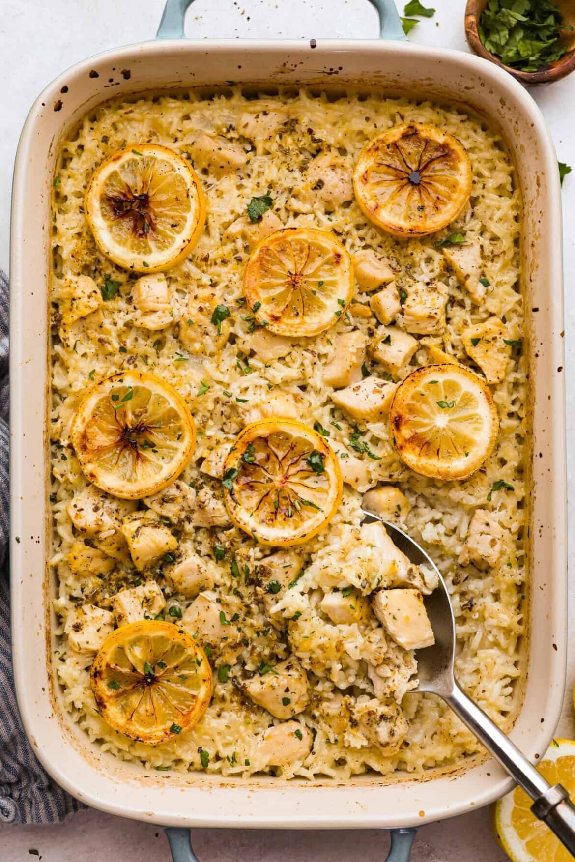 - Cook: Bake for 30 minutes, then place the lemon slices over the top of the dish, and bake for another 5 minutes until the rice is tender and the chicken is cooked through. Remove from the oven and let the dish rest for 5 minutes before serving.