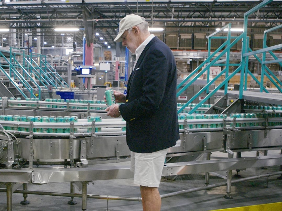 Don Vultaggio standing in one of AriZona's iced tea factories, holding a can of tea.