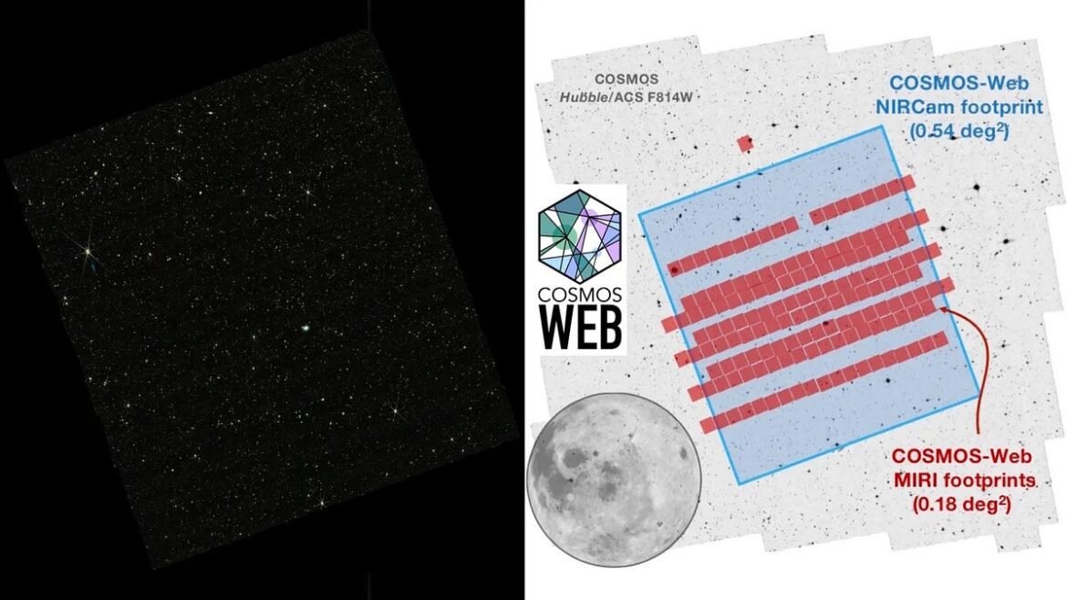 The COSMOS-Web survey, the largest cycle 1 General Observers JWST program, was proposed in 2021 (right) as a large-area survey overlapping with the COSMOS field acquired with Hubble. On the left, the full, completed COSMOS-Web field is shown. (Credit: COSMOS-Web collaboration)