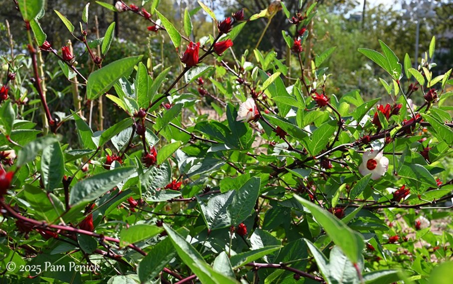 Here’s a plant I’d never encountered — roselle (Hibiscus sabdariffa). The calyx and flower can be used for tea and jam.