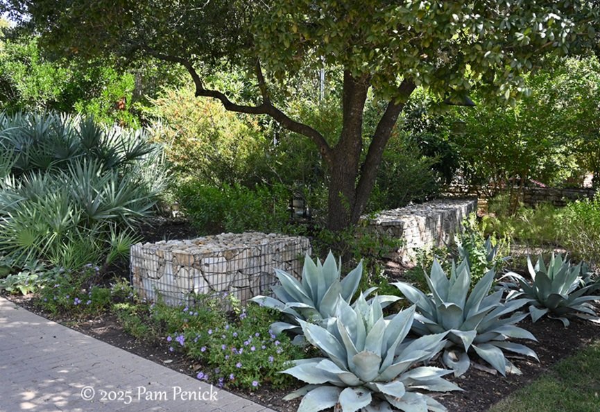 On the other side of the driveway, the gabion wall continues, with a break to accommodate a tree. Silver-blue whale’s tongue agaves cluster in front like chunky starfish.
