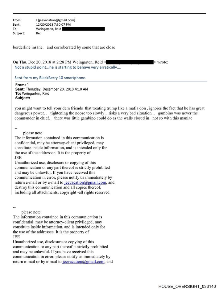 In December 2018, Epstein compared Trump to a mafia don in identical messages sent to Kathy Ruemmler and his attorney Reid Weingarten.