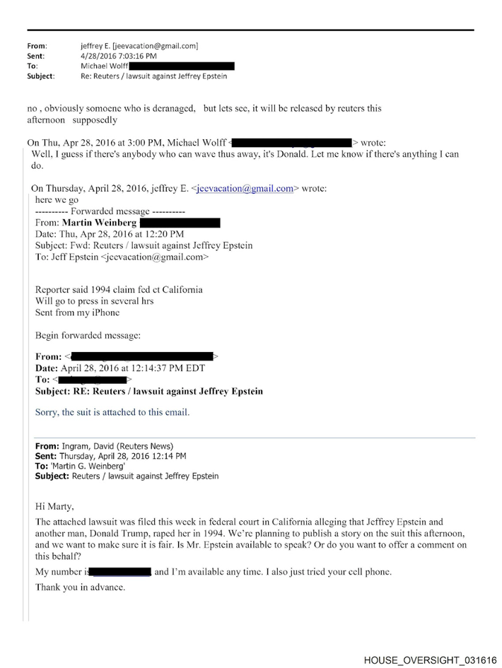 Epstein forward the exchange to Michael Wolff with the note “here we go.” Wolff replied, “Well, I guess if there’s anybody who can wave thus [sic] away, it’s Donald. Let me know if there’s anything I can do.”