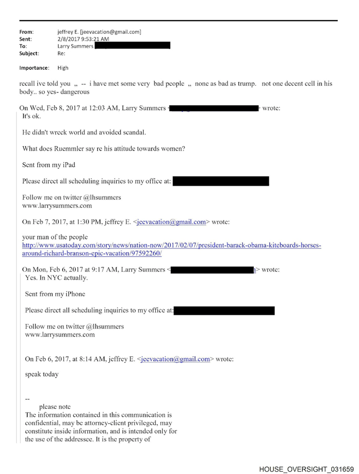 In another 2017 email to Larry Summers, Epstein said, “recall ive told you ,, – i have ment some very bad people ,, none as bad as trump. not one decent cell in his body.. so yes-dangerous.”