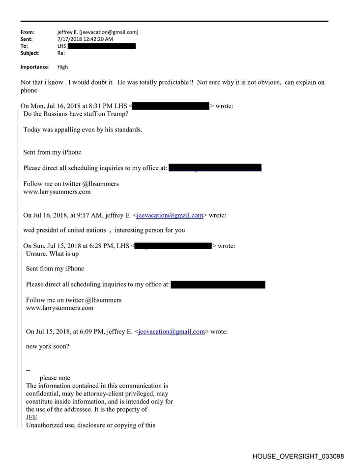 On July 16, 2018, the day Trump met with Putin, Larry Summers asked Epstein, “Do the Russians have stuff on Trump?,” adding “Today was appalling even by his standards.”
