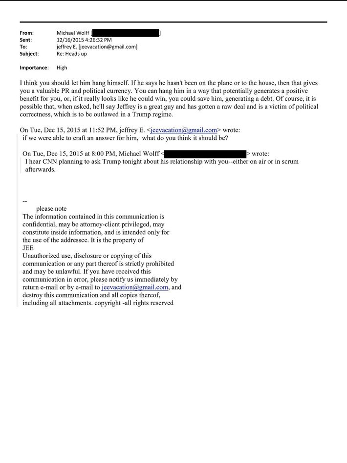 Wolff suggested Epstein should “let him hang himself.” “If he says he hasn’t been on the plane or to the house, then that gives you a valuable P.R. and political currency” he wrote, saying that could later be used to “hang” Trump later, or “save him, generating a debt.”