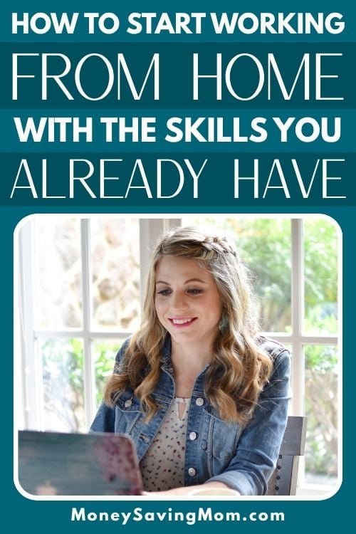 Promotional graphic with a headline that reads “How to start working from home with the skills you already have.” Below the text, a smiling woman with curled blonde hair and a denim jacket sits at a table using a laptop.