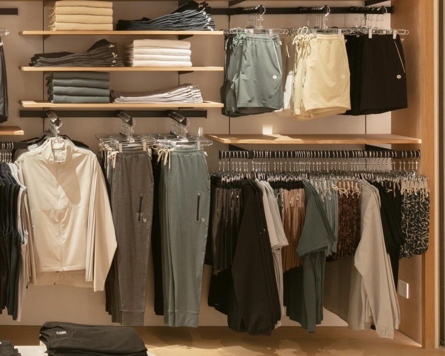 many vuori clothing items on racks in store