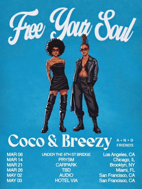 DJ duo Coco & Breezy are launching The Free Your Soul Tour, a concept that packages wellness programming and nightlife performances into a single ticketed experience. The tour hits LA, Brooklyn, Chicago, and San Francisco starting in March, with each stop featuring two distinct components: a high-vibrational wellness session followed by a club performance.