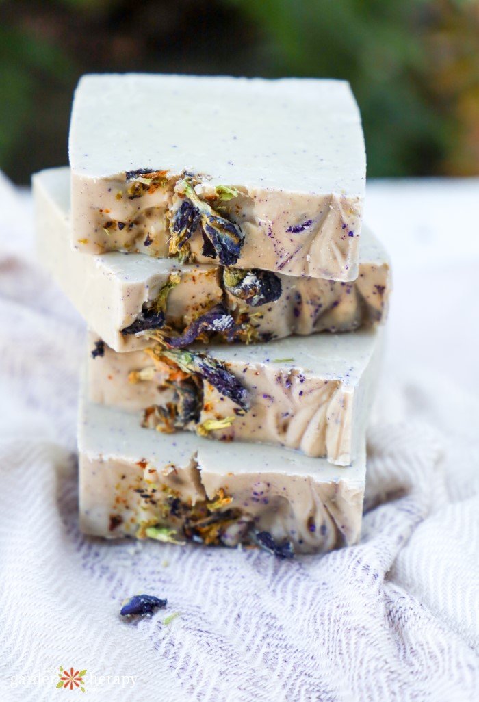 It looks as beautiful as it smells. Coloured 100% naturally with the herbs and tea, additional flecks of purple mica make this bergamot and lavender soap shine. On top, I added butterfly pea flower and lavender buds for the final pop of colour.