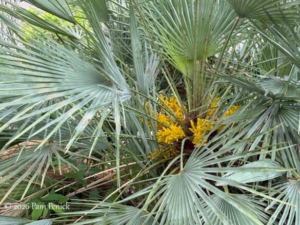 When the silver Mediterranean fan palm (Chamaerops humilis var. argentea) starts blooming, its Cheeto-like panicles seem to glow amid the frosty fronds.