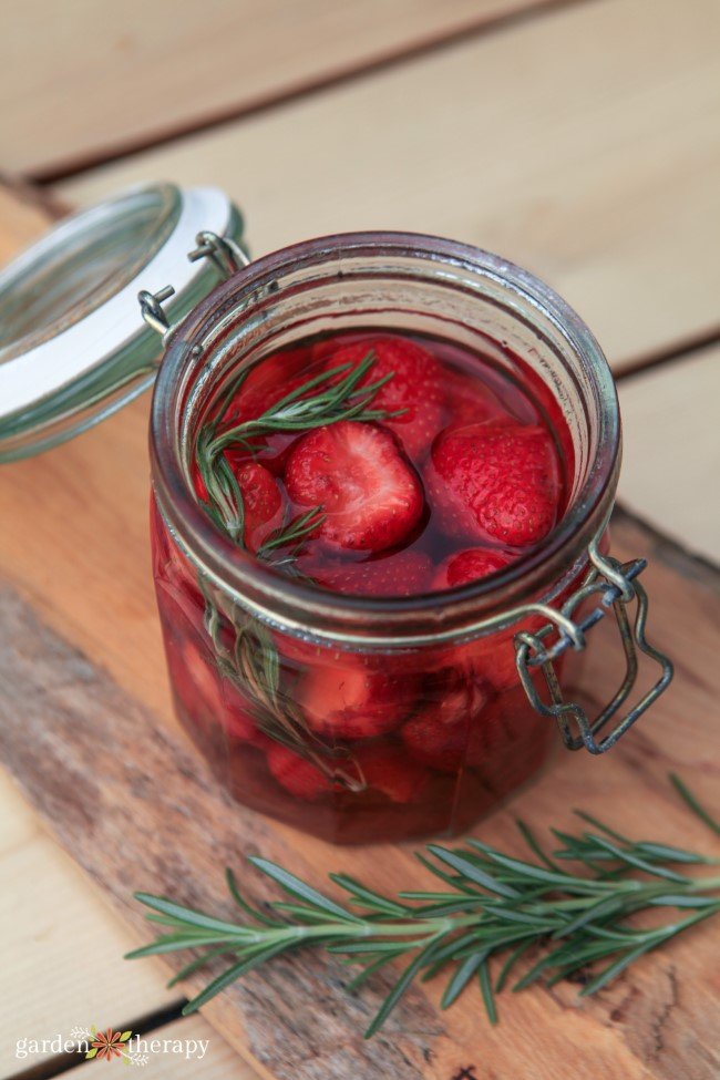The flavor of strawberry pairs really well with herbs. Black pepper, chives, bay, rosemary, and thyme come to mind. In this recipe I’ve added Rosemary, chives and black pepper to make a flavourful vinegar to dress up Summer meals. I picked a few of these to jazz up my savory Strawberry Vinegar recipe but feel free to switch it up and add your own ideas!